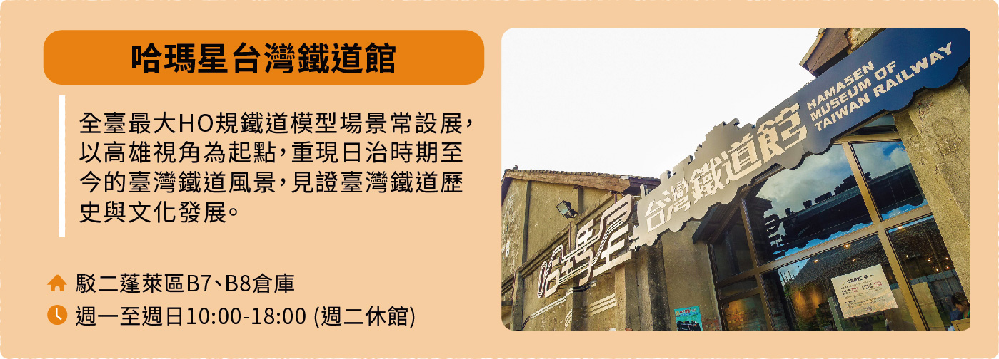 2024年是高雄設市百年,重啓鐵道復駛是城市年度最重要的計畫之一,除了「哈瑪星號」火車運行,更從全台各地搜羅了各式各樣的火車車型,展示於哈瑪星鐵道園區。邀請大家一同見證高雄現代化發展的起點,搭上這班歷史列車,重返哈瑪星的風華年代!